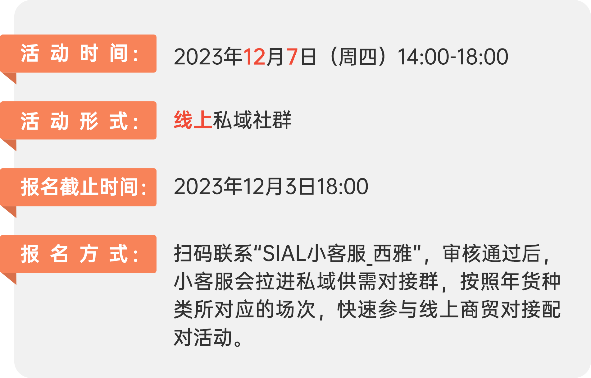 為了助力品牌商、經銷商、商超等食飲全產業鏈打好年底最后也是最硬一場“戰役”,SIAL西雅國際食品展將于12月7日再次發起線上供需對接活動“SIAL西雅展秋冬食飲采購節”,以私域流量為食飲行業供需雙方實現年底完美收官再添助力。