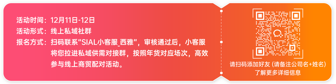 2023 SIAL西雅展秋冬食飲采購節(jié)吸引2000+家食飲上下游企業(yè)、數(shù)萬專業(yè)買家共同參與,10+私域社群聯(lián)動推介熱門年貨產(chǎn)品,專業(yè)買家線上集中選品,與意向采購展商高效建立商貿(mào)合作鏈接。