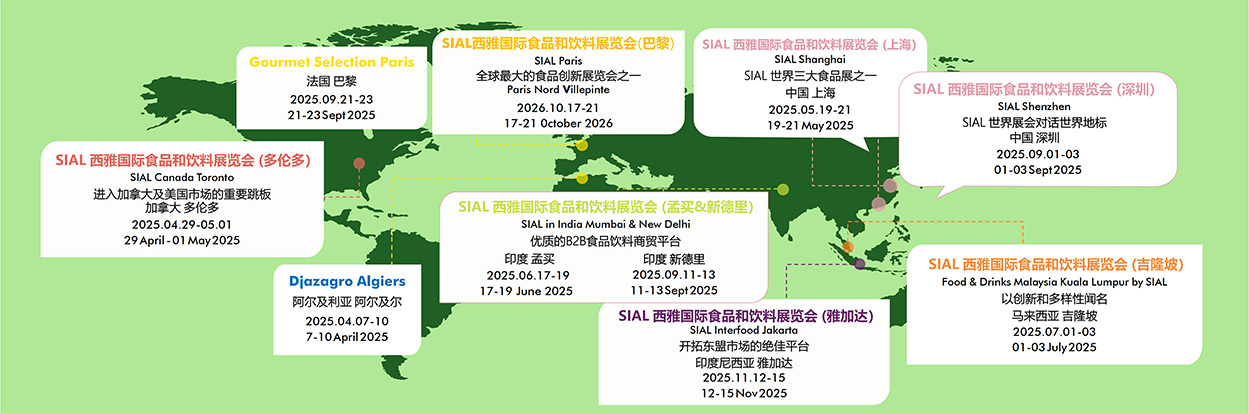 SIAL全球系列食品展今年累計服務全球1.7萬展商、70萬專業觀眾,2025年SIAL全球系列食品展將在上海、深圳、巴黎、蒙特利爾/多倫多、新德里、吉隆坡、雅加達等地舉辦,展現世界食品創新趨勢,探索應對未來食品挑戰的解決方案。