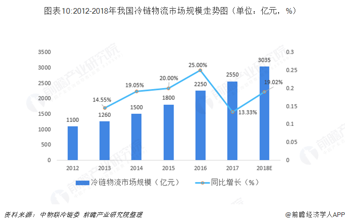 2018年中國冷鏈物流需求總量約為1.8億噸,比上年增長3300萬噸,同比增長22.1%;冷鏈物流市場規模為3035億元,比上年增長485億元,同比增幅19%。到2019年,我國冷鏈物流市場規模預計將達到3780億元。