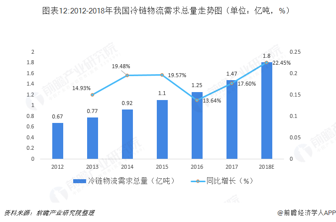 而且,伴隨著人們的消費觀念和飲食觀念的轉變,衛生健康越發重要。種觀念上的轉變對農產品、乳制品、肉類加工品等食物的安全問題提出了更進一步的要求,從而導致對冷鏈物流需求的迅速增長。預計2018年,我國冷鏈物流需求總量將會達到1.8億噸,比上年增加3300萬噸,同比增長22.1%