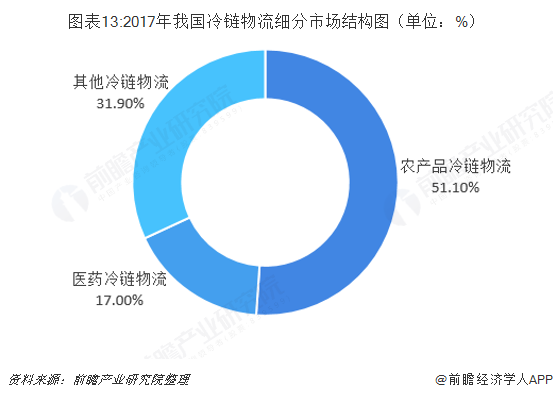 冷鏈物流行業的終端需求大體上包括農產品冷鏈運輸及配送、醫藥冷鏈運輸及配送以及化工冷鏈等三大部分。2017年,在冷鏈物流市場中,農產品冷鏈物流占比超過一半,達到51.1%;醫藥冷鏈物流占比其次,為17.0%