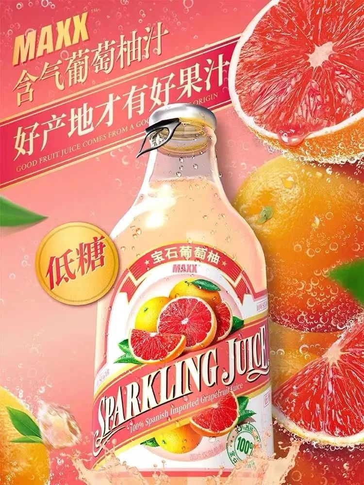 元氣森林的果汁新品屬于旗下子品牌“MAXX”,目前僅有葡萄柚一個口味。在產品賣點上,MAXX含氣葡萄柚汁采用西班牙穆爾西亞進口西柚汁,同時強調“低糖”屬性。