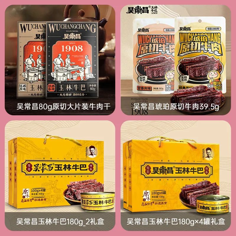 吳常昌始創(chuàng)于1908年。是廣西玉林市歷史悠久最負(fù)盛名的牛巴品牌。工藝傳承自南宋。精選牛后腿肉,獨(dú)家秘方烹制而成,色似咖啡,美味甘香,風(fēng)味獨(dú)特。