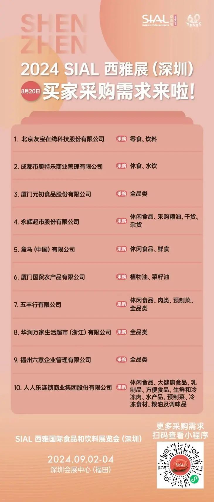2024 SIAL西雅展(深圳)參觀申請(qǐng)火熱進(jìn)行中,如果您想新增采購(gòu)渠道,尋找特定產(chǎn)品、新品、認(rèn)識(shí)更多品牌,請(qǐng)點(diǎn)擊預(yù)登記,提前與參展商做生意,獲更多貿(mào)易商機(jī)。掃描下方二維碼也可免費(fèi)領(lǐng)票。