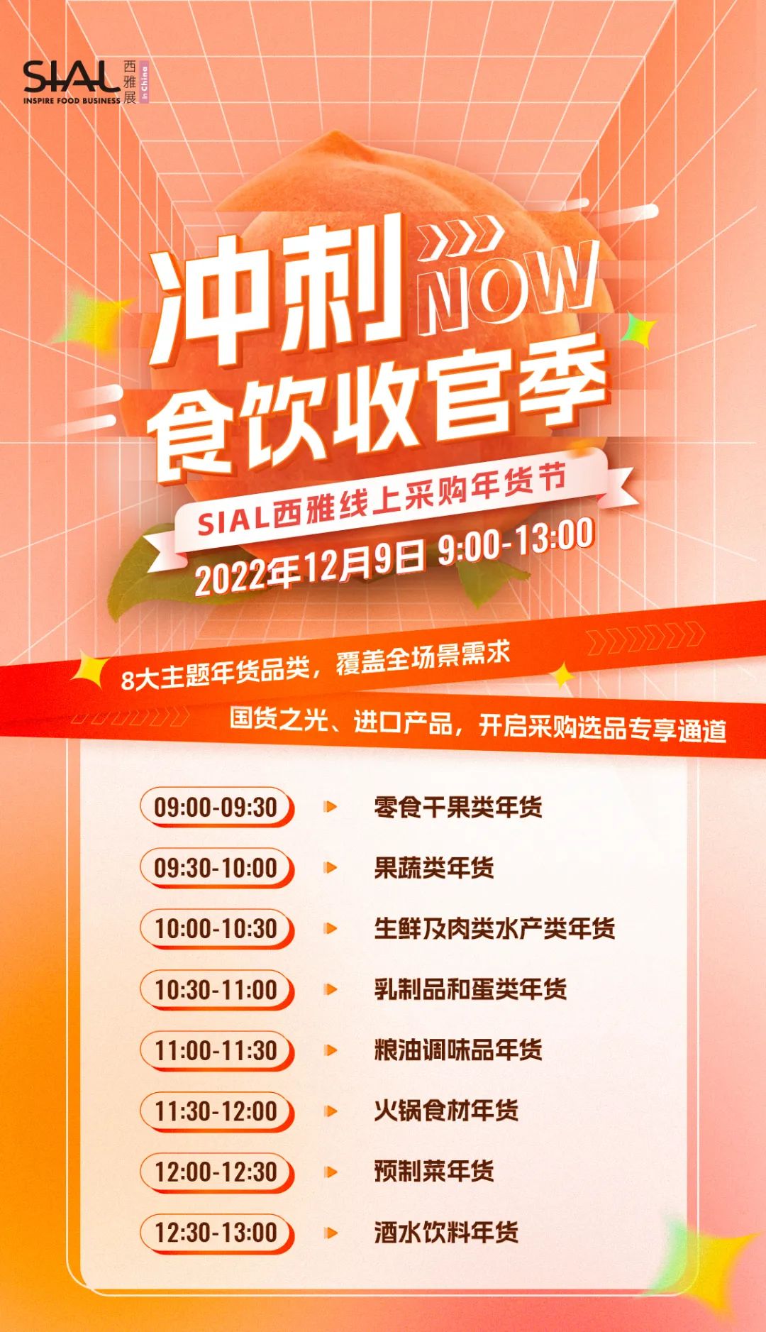 本次私域供需對接,將繼續以“SIAL西雅線上采購年貨節”8大年貨品類為依托,包括:零食干果類年貨、果蔬類年貨、生鮮及肉類水產年貨、乳制品和蛋類年貨、糧油調味品年貨、火鍋食材年貨、預制菜年貨、酒水飲料年貨等,通過SIAL西雅展私域社群,為食飲行業供應商和采購商提供商貿對接機會。