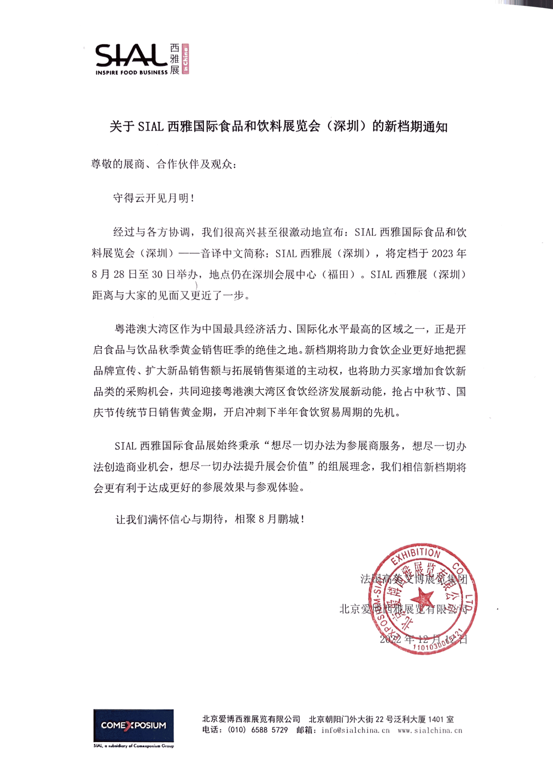 經過與各方協調,我們很高興甚至很激動地宣布:SIAL西雅國際食品和飲料展覽會(深圳)——音譯中文簡稱:SIAL西雅展(深圳),將定檔于2023年8月28日至30日舉辦,地點仍在深圳會展中心(福田)。SIAL西雅展(深圳)距離與大家的見面又更近了一步。