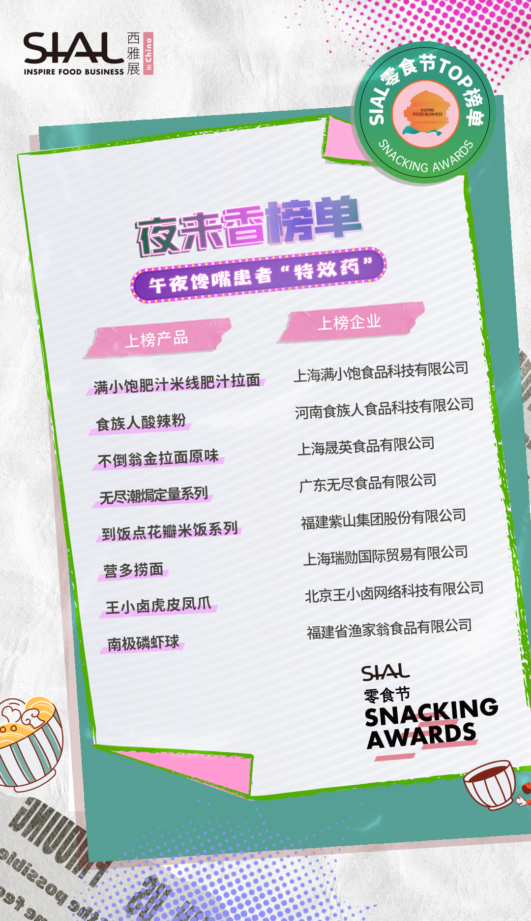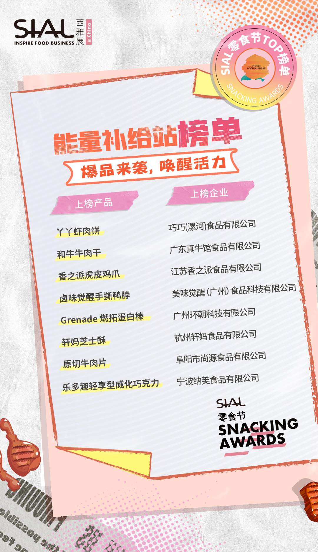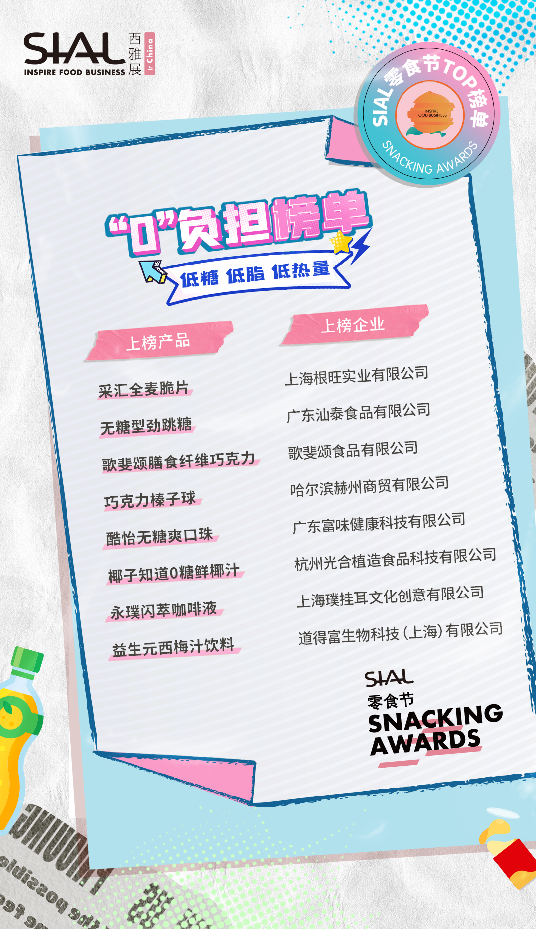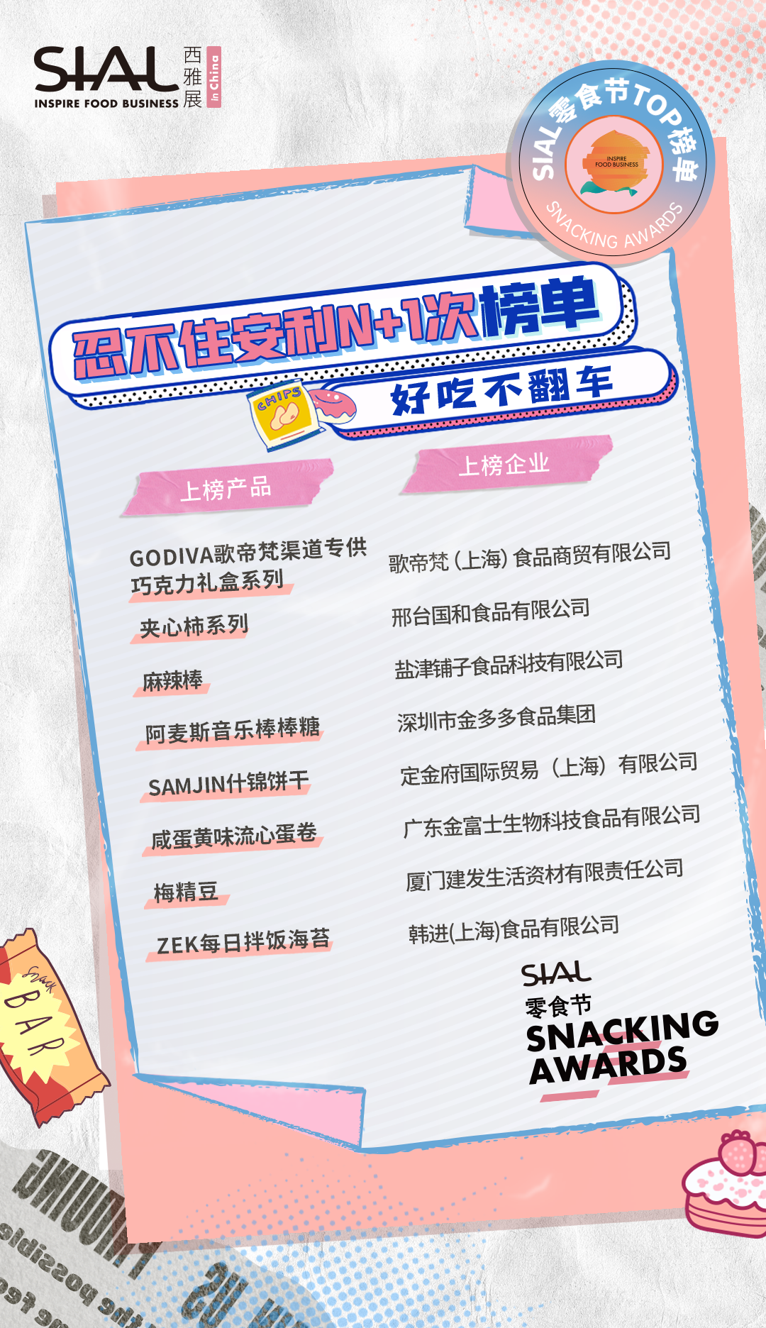 本次活動共計80家企業及產品榮膺SIAL零食節TOP榜單。上榜產品,均由C端消費者、B端專業用戶、頭部KOL、主辦方從“顏值包裝”“口味好評”“時下熱度”“健康低卡”“方便快捷”“創意獵奇”等多維度測評而出。