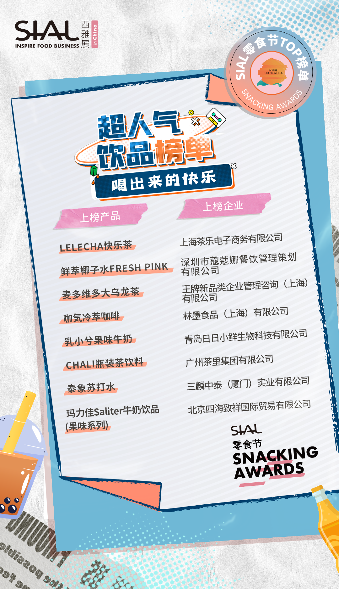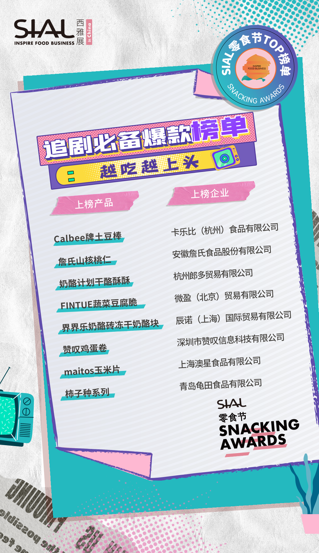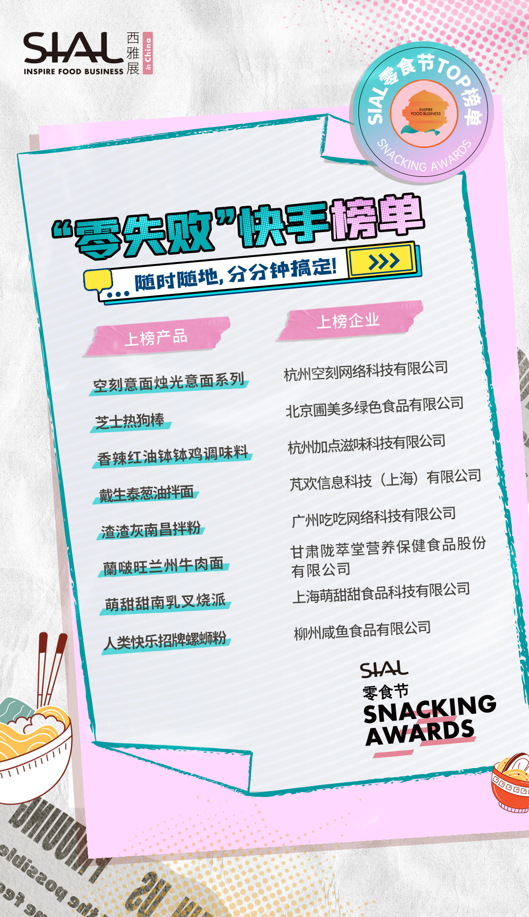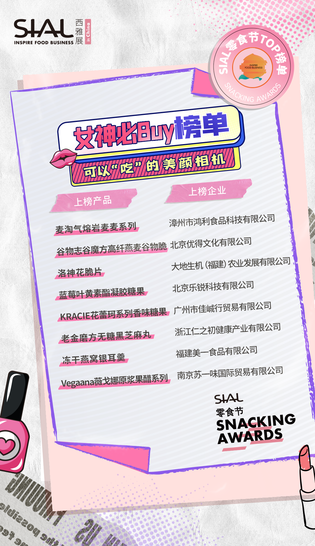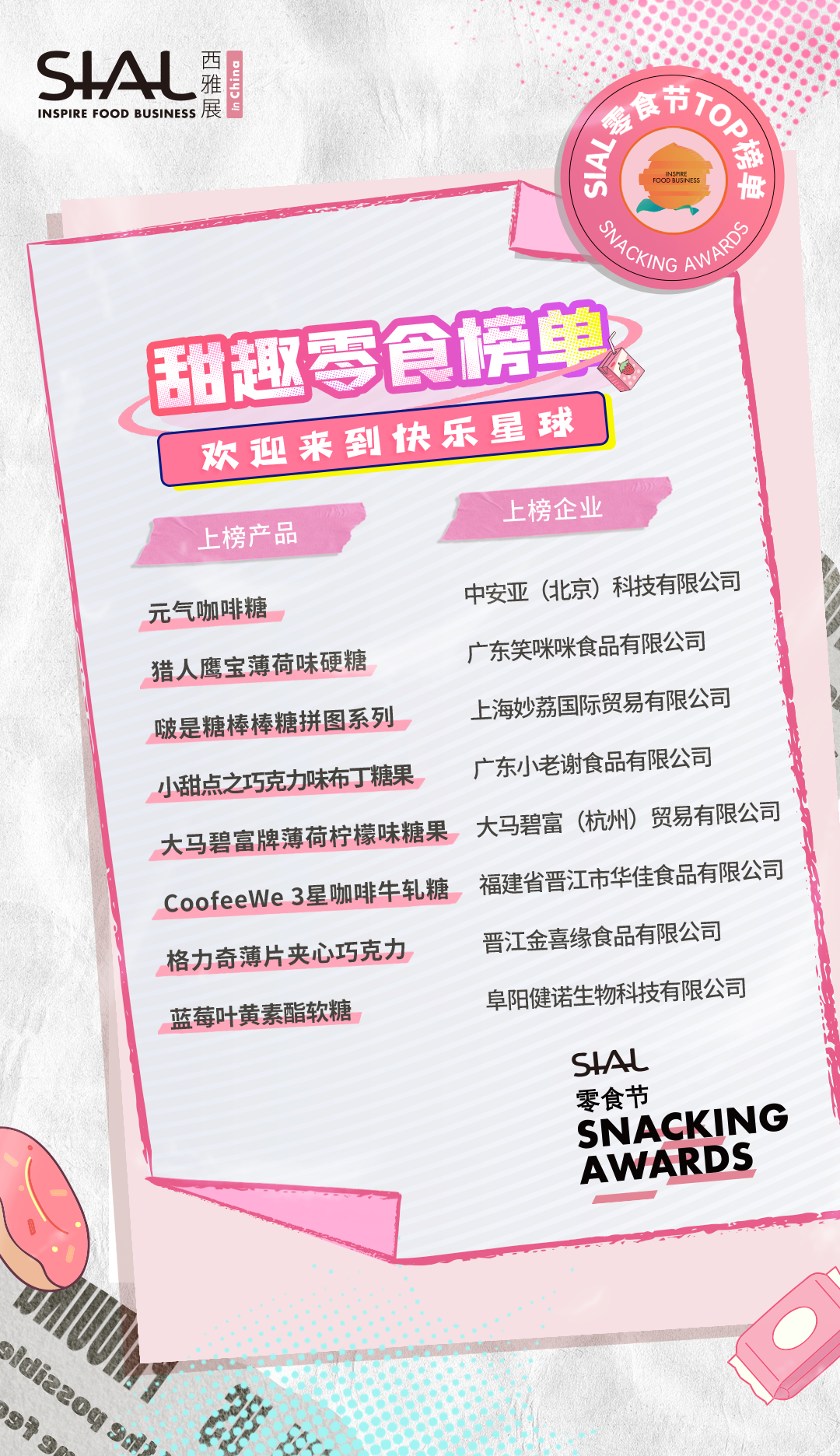 本次活動共計80家企業及產品榮膺SIAL零食節TOP榜單。上榜產品,均由C端消費者、B端專業用戶、頭部KOL、主辦方從“顏值包裝”“口味好評”“時下熱度”“健康低卡”“方便快捷”“創意獵奇”等多維度測評而出。