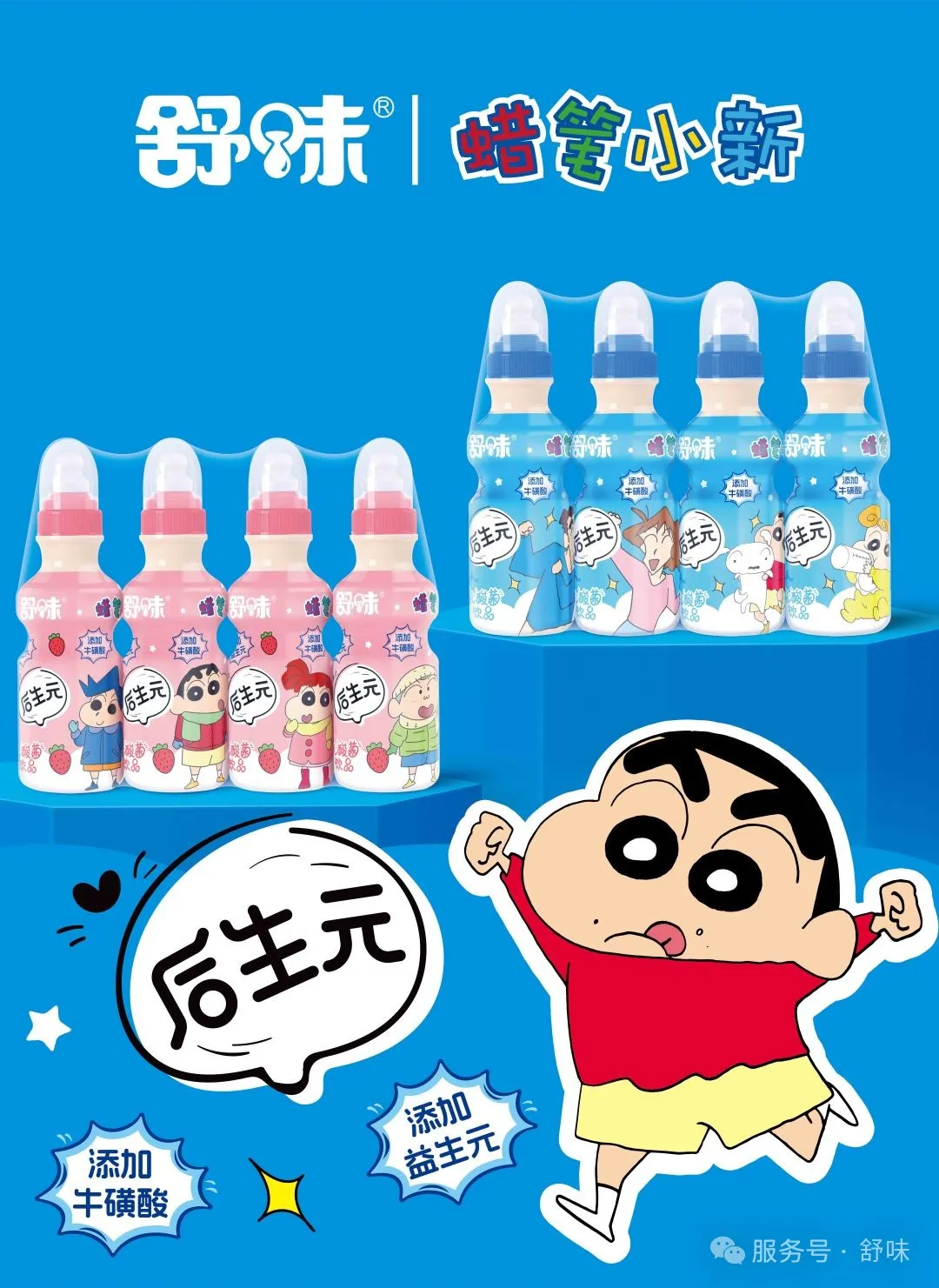 產品亮點:聯合活潑可愛的蠟筆小新形象推出的舒味乳酸菌,添加牛磺酸、益生元,自然發酵,純正好味,0脂健康,適合朋友小聚時來一瓶。